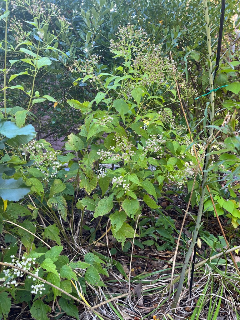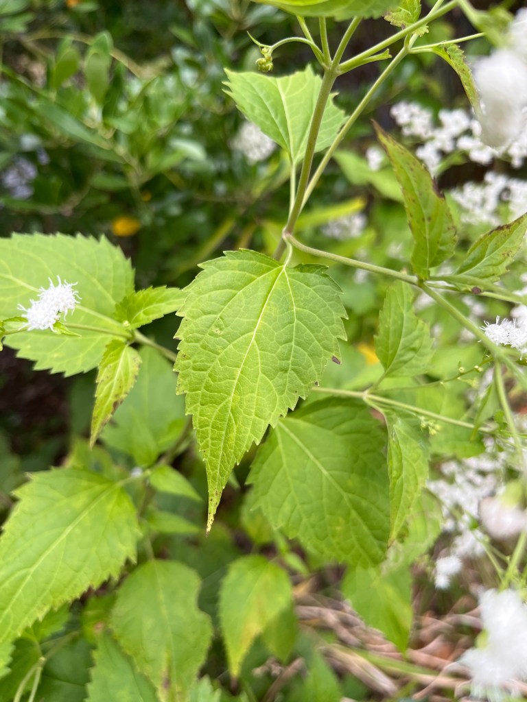 You may think this is a weed. We tend to think of weeds as not pretty, gangly, something you didn’t plant or invite in. But the native White Snakeroot (Ageratina altissima) is not a weed, although when it first pops up you may think it’s acting like one.